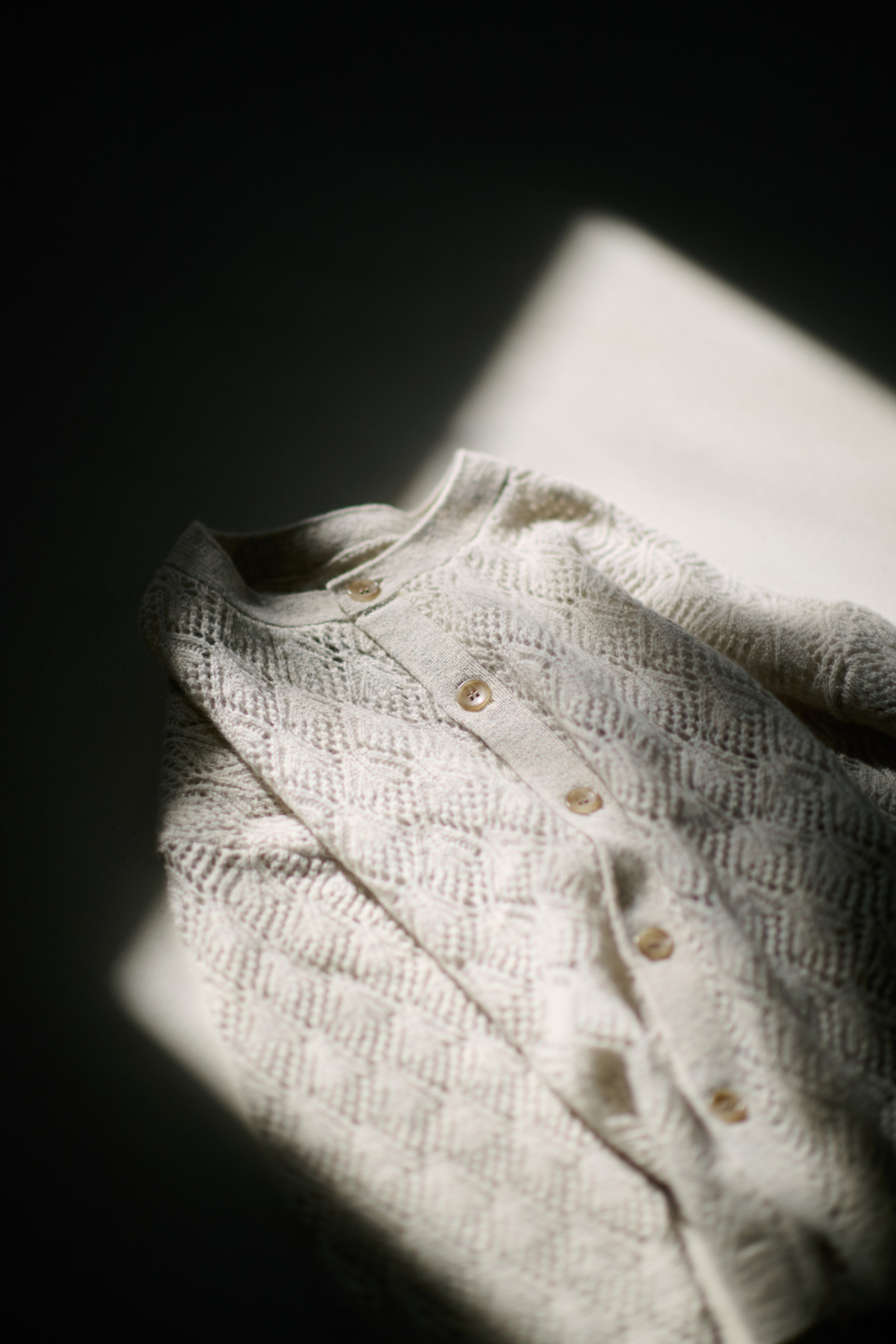 足元で重なる落ち葉を写した、シアーな質感のニット。